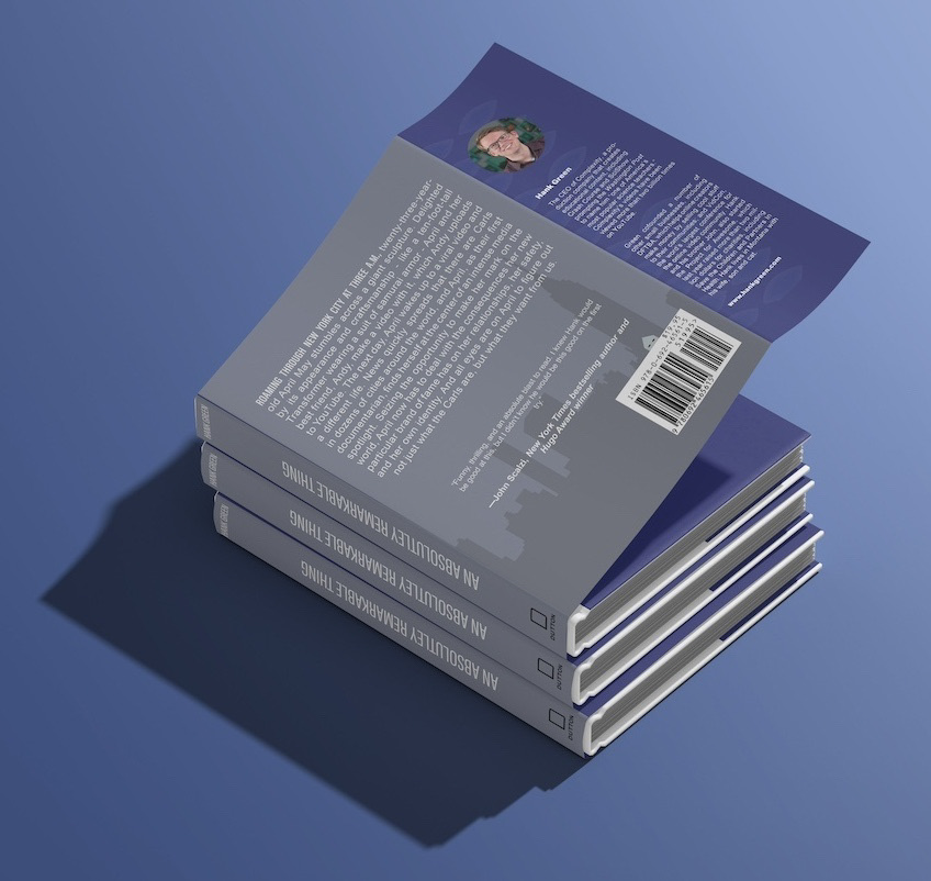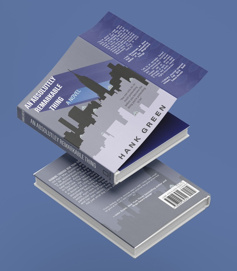 Redesign an existing book dust jacket, including inside flaps. The book I chose was An Absolutely Remarkable Thing by Hank Green. A novel about alien robots sprouting up all over the world, set in New York City.